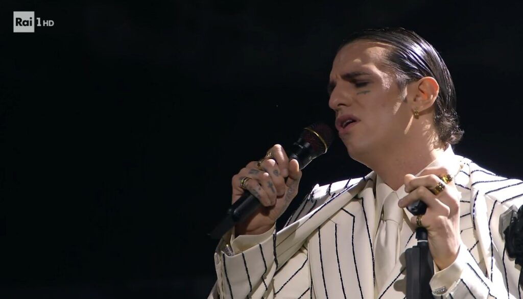 A completare l’ensemble, capelli pettinati all’indietro con effetto bagnato, un dettaglio che enfatizza l’estetica dandy e teatrale del cantante. Anche il trucco non passa inosservato: tratti marcati sugli occhi, a richiamare l’iconografia rock e il mondo dell’arte performativa.