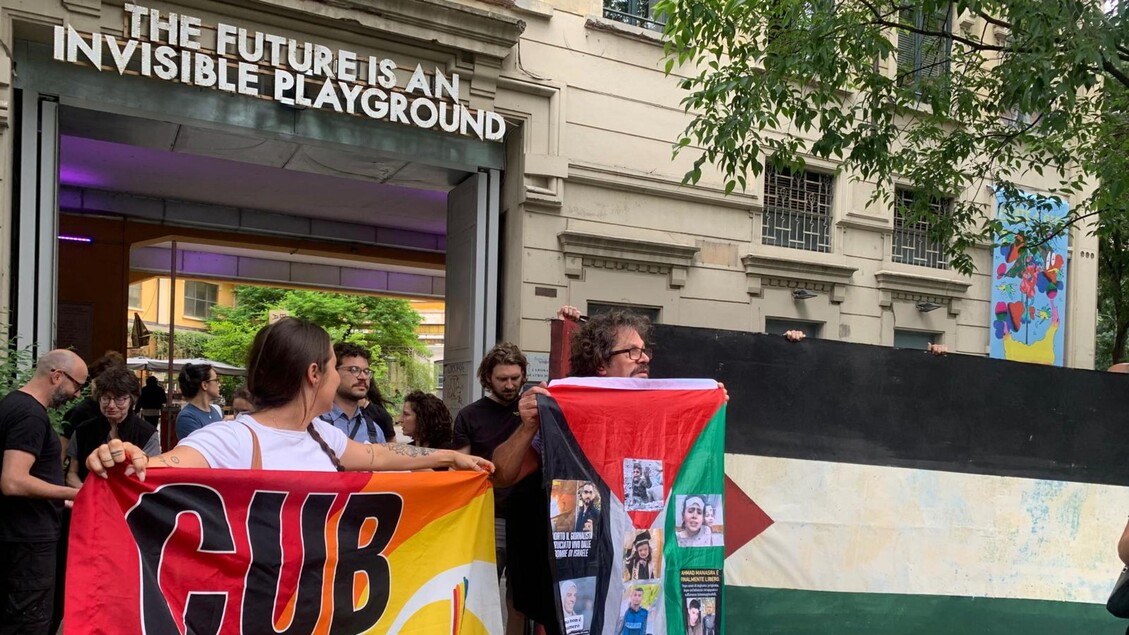 A Milano flash mob davanti ai laboratori Ansaldo della Scala per protestare contro il licenziamento di una maschera che ha esposto la bandiera palestinese durante l’assemblea Asian Development Bank con Giorgia Meloni.