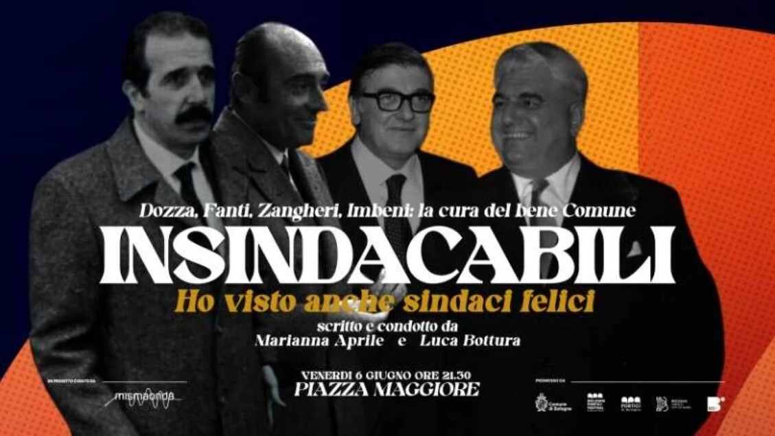 La serata del 6 giugno offre uno spettacolo che ha per titolo “Insindacabili: Dozza, Fanti, Zangheri, Imbeni. La cura del bene Comune”. L’appuntamento inizierà alle 21.30 in Piazza Maggiore, luogo simbolico di Bologna. Il giornalista Luca Bottura e la conduttrice Marianna Aprile guideranno la narrazione, affiancati da contributi visivi tratti dal documentario di Michele Mellara e Alessandro Rossi, “La febbre del fare”, che racconta la politica bolognese dagli anni immediatamente successivi alla guerra fino alla fine degli anni Settanta.
