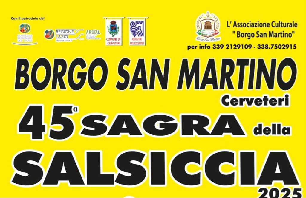 La 45ª edizione della Sagra della Salsiccia si terrà a Borgo San Martino, frazione di Cerveteri, dal 5 al 7 settembre 2025. L’evento rappresenta un momento importante per la comunità, con un programma che unisce sapori locali, spettacoli e momenti di festa adatti a tutte le età. Tra le proposte di quest’anno figurano concerti, cabaret, mercatini e iniziative legate alle tradizioni del territorio.