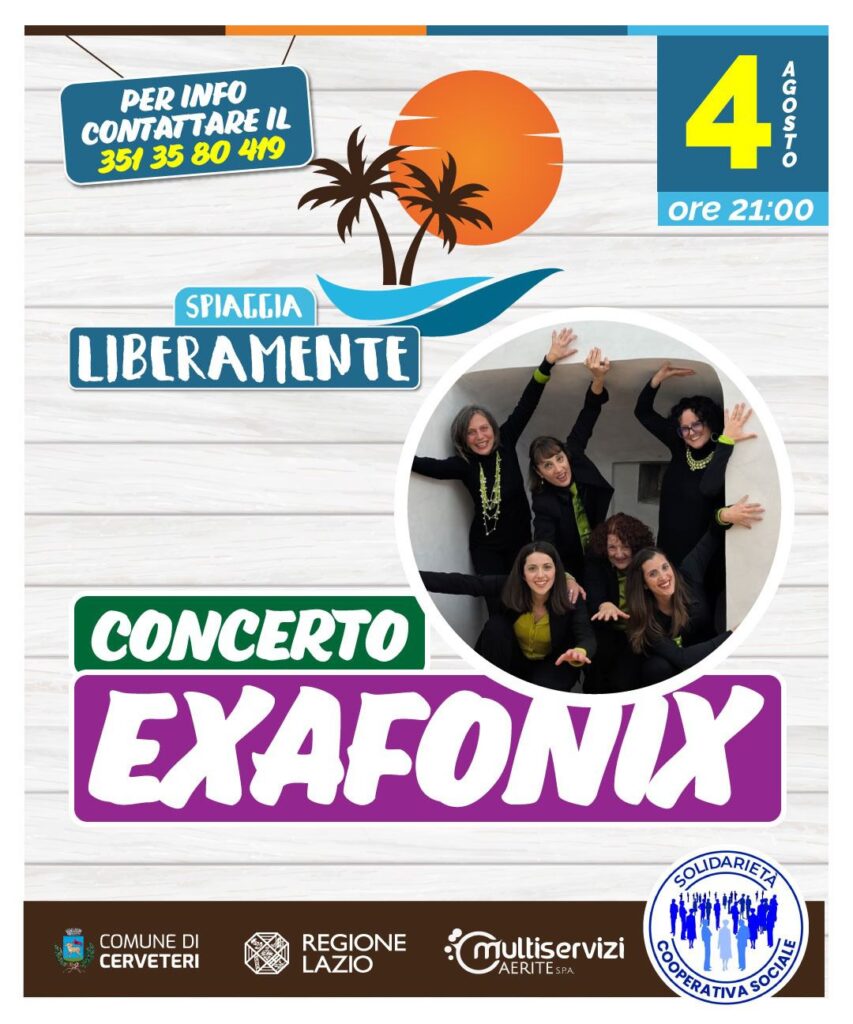 Il 4 agosto la spiaggia liberamente di Cerenova ospiterà un concerto live delle exafonix, gruppo vocale noto per le sue esibizioni coinvolgenti. L’evento si svolgerà in una location accessibile, pensata per accogliere anche persone con disabilità motorie, garantendo un ambiente inclusivo. L’appuntamento è alle ore 21:00, per una serata all’insegna della musica e della convivialità estiva.