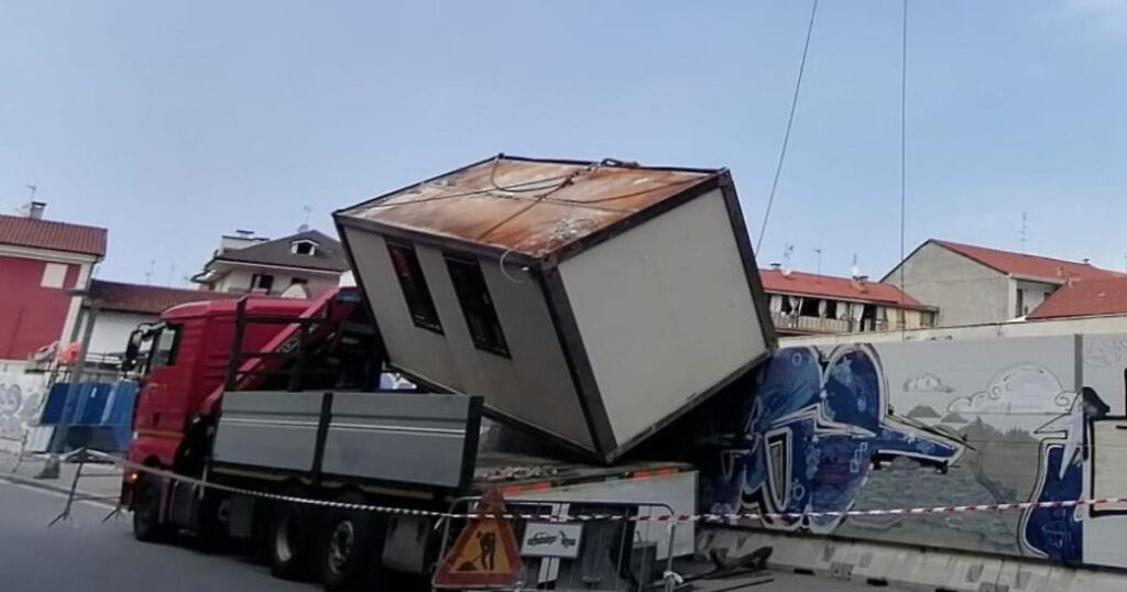 L’incidente si è verificato durante le operazioni di posizionamento di una baracca prefabbricata, uno dei monoblocchi prefabbricati utilizzati dagli operai come spazio di lavoro temporaneo. Mentre la struttura veniva sistemata, questa è rimasta in bilico sulla parete che delimita il cantiere. La precarietà del monoblocco ha richiesto manovre immediate per evitare il ribaltamento o una caduta, che avrebbero potuto causare conseguenze ben più gravi.