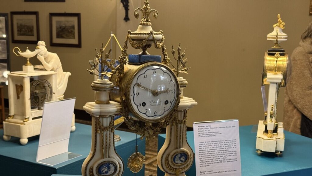 Tra i quattro orologi donati, il più antico è una pendola a portico realizzata in Svizzera dalla Maison Robert et Courvoisier. Questo esemplare, prodotto alla fine del 1700 e all’inizio del 1800, è un esempio straordinario di artigianato del tempo. L’eleganza delle elaborazioni sartoriali della pendola è rappresentativa del gusto dell’epoca, che ricercava una fusione tra funzionalità e bellezza estetica.