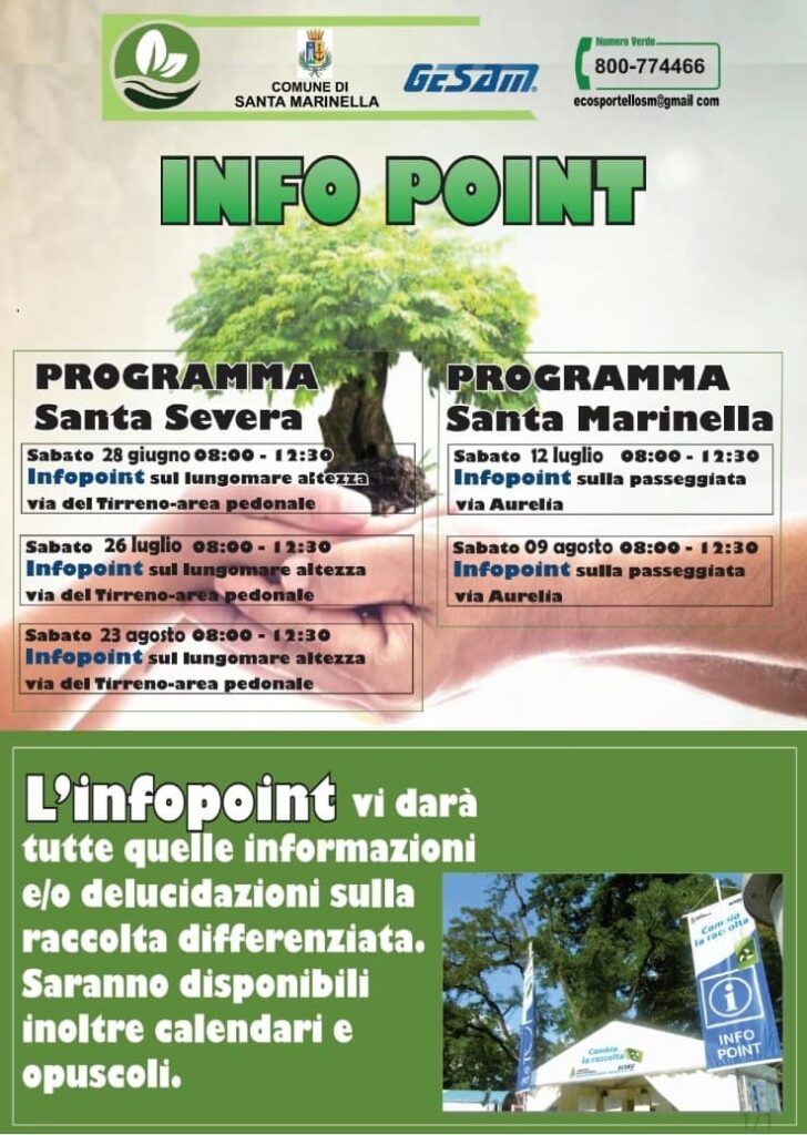 Il Comune di Santa Marinella ha organizzato una serie di appuntamenti in collaborazione con Gesam per promuovere una corretta raccolta differenziata. I cosiddetti Infopoint saranno montati in due zone strategiche: a Santa Marinella sulla Passeggiata, cuore pulsante del paese, e a Santa Severa sul Lungomare, precisamente in corrispondenza di via del Tirreno, zona pedonale molto frequentata. Questi stand saranno attrezzati con gazebo presidiati da personale specializzato pronto a fornire assistenza.