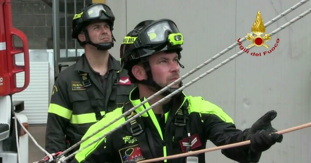 I pompieri hanno allestito rapidamente una scala per raggiungere l’uomo, che ormai appariva stanco e fradicio. La pioggia rendeva la manovra più complicata, ma l’esperienza del nucleo SAF ha permesso di affrontare la situazione con precisione. Dopo alcuni minuti concitati, gli operatori sono riusciti a bloccare l’individuo, portandolo in salvo senza che riportasse ferite.