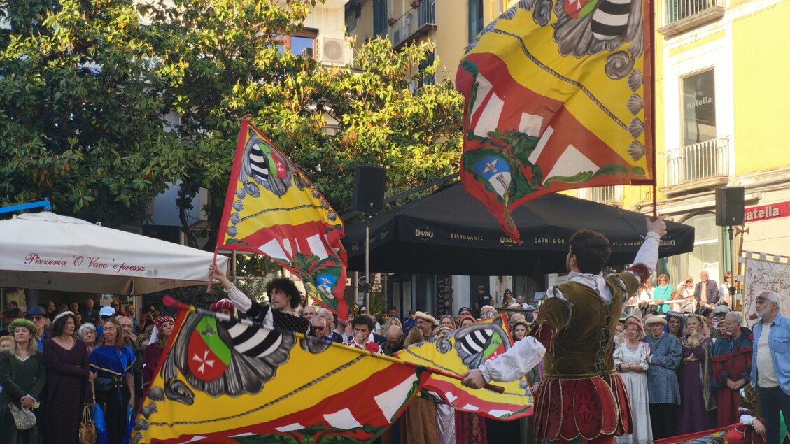 Piazze di gioco e teatri all’aperto hanno ospitato rappresentazioni con giullari, saltimbanchi, cantastorie e burattinai, coinvolgendo il pubblico con numeri che spaziano dai giochi di fuoco alle esibizioni con uccelli rapaci. Tra i momenti più applauditi delle prime ore, si segnalano le performance del gruppo sbandieratori Città de la Cava “Li Quattro Distretti – Luca Barba” 1969, i Falconieri dell’Irno con i voli acrobatici dei rapaci e gli artisti di Magma Musica e Giullaria.
