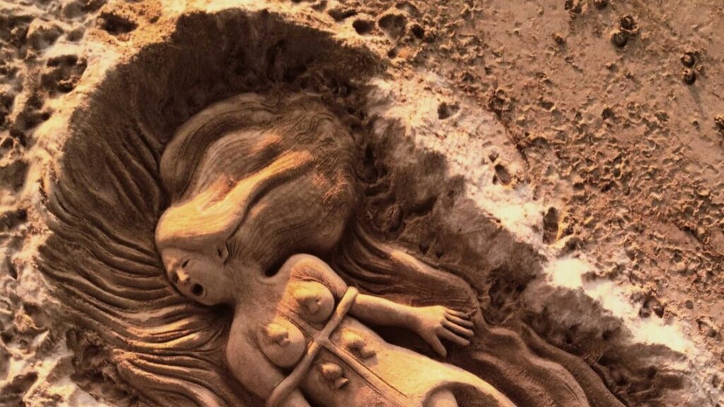 Sulla spiaggia di Platamona, vicino a sassari, è comparsa una grande scultura di sabbia che racconta la tragedia degli incendi che hanno colpito la sardegna negli ultimi giorni. L’opera, realizzata dall’artista Nicola Urru, rappresenta in modo potente e doloroso lo stato dell’isola: una figura anziana, simbolo della sardegna, inchiodata a un palo e avvolta dalle fiamme. Questo altorilievo vuole diventare un segno visibile del grave danno che le fiamme stanno causando al territorio, al paesaggio naturale e alla memoria storica dell’isola.